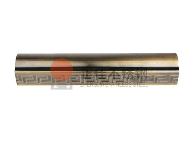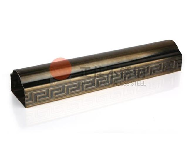 本款產(chǎn)品是新型的藝術不銹鋼裝飾管,在不銹鋼裝飾管的表面壓出回形花紋再鍍銅使不銹鋼管表面呈現(xiàn)古銅色,可以定制各種個性化花紋。